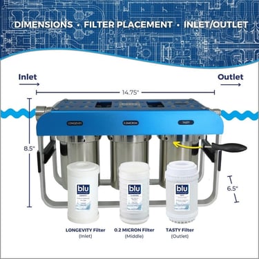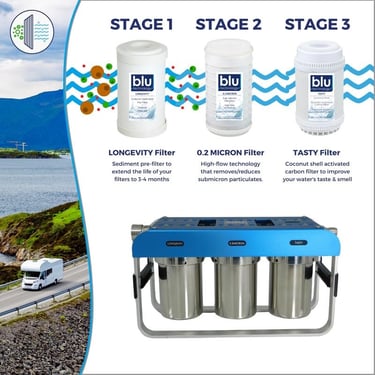 GoBluTech AR3, RV Water Filter System, 0.2 Micron Filter for Campers with Compact 5-inch Filters, 3 Stage Premium Filtration System, for RVs, Vans, and Boats - US Veteran Owned. This is a paid link