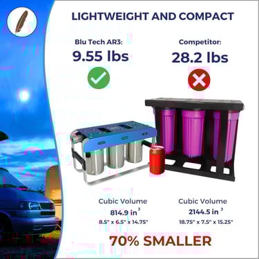✅ Compact and Lightweight; The perfect addition to your camping accessories; the AR3 comes with an ultra-lightweight polycarbonate carbon fiber frame, and our compact 5 inch filters; making Blu Technology the most compact system on the market. Operating temperatures: 40°F-125°F